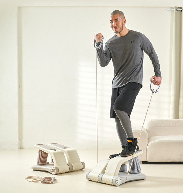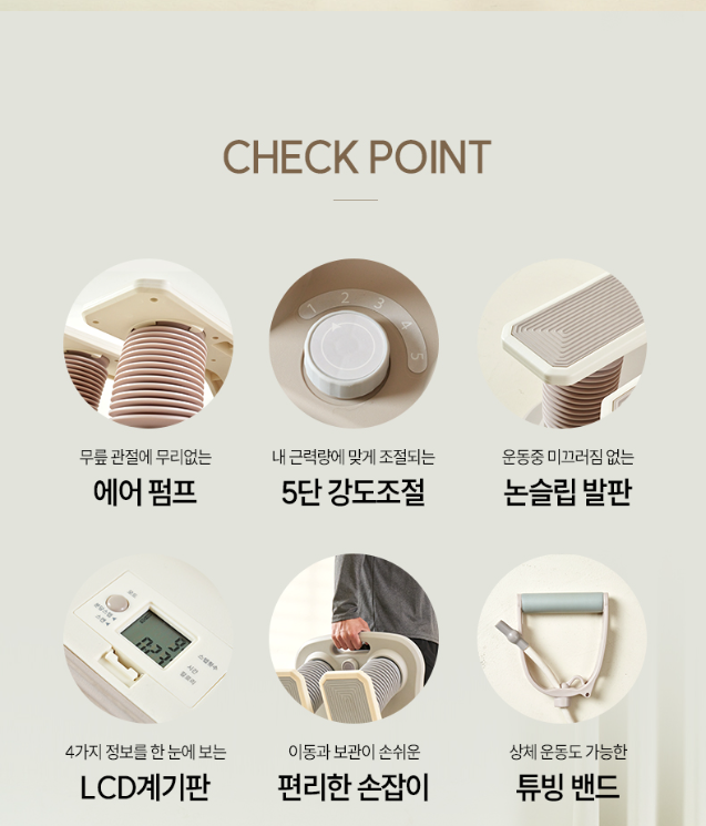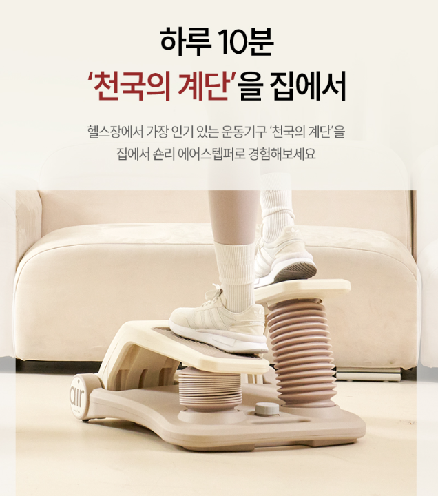 이 제품은 천국의계단 계단오르기 원리를 살리면서 집에서도 짧게는 하루 10분 정도 타기 좋게 설계됐어요. 에어 펌프가 쿠션 역할을 해 무릎 관절을 보호하고, 넓은 TPR 논슬립 발판으로 맨발이나 양말 모두 안정감을 줍니다. 시간, 칼로리, 스텝 수를 보여주는 계기판과 상체 운동까지 가능한 길이 조절 튜빙 밴드가 포함돼 홈트 유산소 운동과 하체 근력 운동을 함께 노려볼 수 있다는 점이 특징이에요.