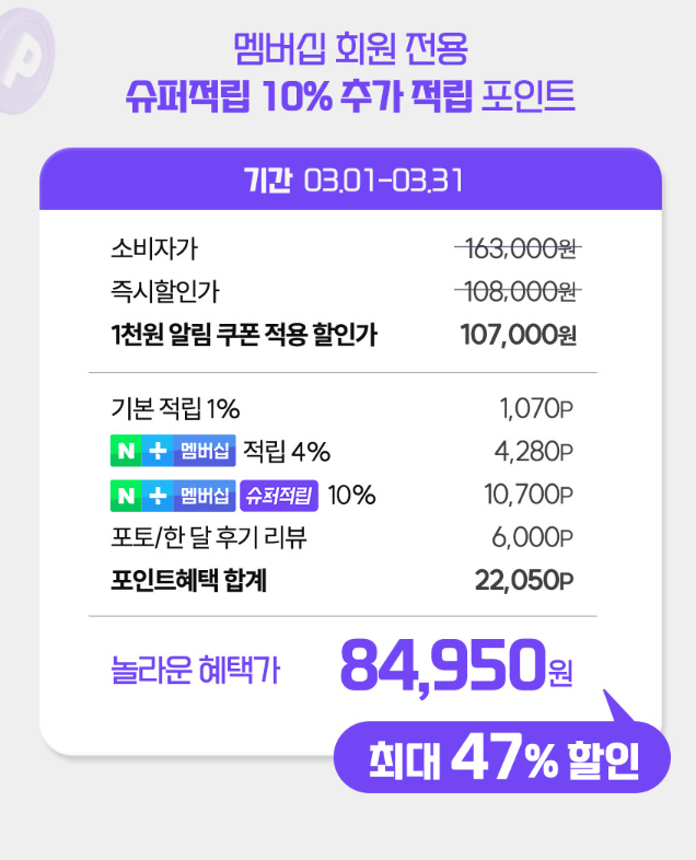 3월 한달간 할인하고있어서 체감 가격은 84,950원이에요